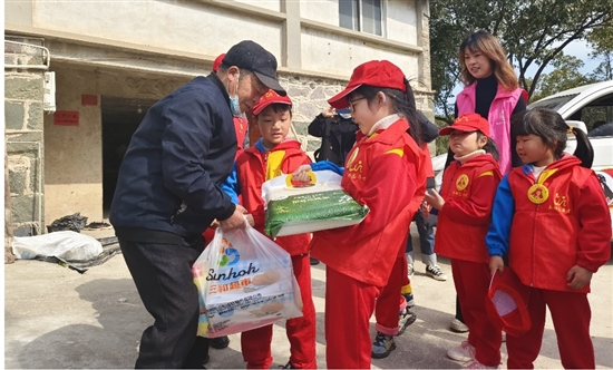 队长张金华向孩子们讲述了雷锋事迹和义工队献爱心的故事,让雷锋精神深入幼儿们的心中。现场,小萌娃们佩戴雷锋勋章,一起宣誓学雷锋做小事,争做时代好少年。随后在老师和义工的带领下,孩子们来到冷水塘村,为生活困难的老人们送去义工队提供的大米、油和生活用品,还主动和老人们交流,祝愿他们健康长寿。