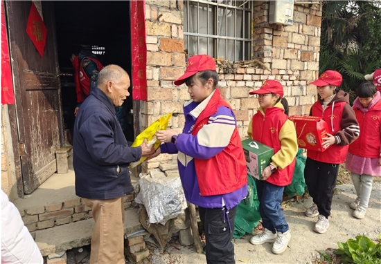 箬横镇新区小学红领巾志愿者用白菜义卖款购买生活物资,看望孤寡老人。