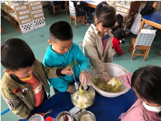 白菜营养又美味,孩子们一起讨论烹饪方式,择白菜、洗白菜、切白菜、煮白菜,动手制作出了各种“白菜美食”:拌白菜丝、白菜炖粉条、白菜疙瘩汤、白菜饺子、白菜“福袋”……孩子们一口一口吃得可真香!