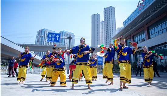 本报讯(记者姚天/文 章毅/图)3月4日,上千位福建游客搭乘“曙光首照地 东海好望角”温岭旅游冠名列车到达温岭。为热烈欢迎游客到来,在温岭火车站换乘中心入口广场,国家级非遗项目“大奏鼓”精彩上演。