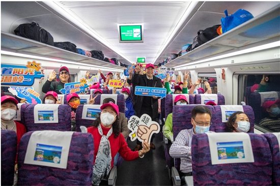 福建游客搭乘温岭旅游冠名列车。