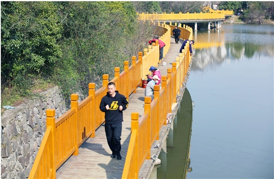 近日,市区北山河健身绿道,油漆工人在涂刷沿河栈道护栏防腐漆,市民在绿道上慢跑锻炼健身。