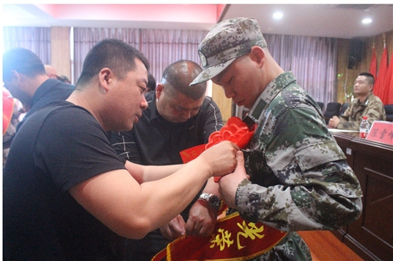 城南镇相关人员依次给新兵发放了入伍通知书,并向他们表示祝贺。随后,新兵家属们上台,为他们披上“参军光荣”绶带,戴上红花,眼中无不流露出浓浓的不舍之情。紧接着,新兵代表上台发言,表示将坚决遵守部队的规章制度,苦练本领,掌握高超的军事技术,为祖国现代化建设站好岗、放好哨。