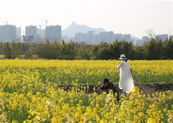 风日晴和,市区田园路以西中心大道和阳光大道之间的大片油菜花盛开,与周边的高楼、远处的山峰相映成趣,美不胜收,吸引了众多市民前往踏青、赏花、放风筝。 记者 黄晓慧摄