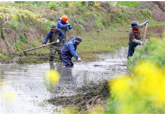 城南镇冷水塘河,数位农民冒着细雨在清杂草、铲淤泥、拖杂物,疏浚河道、池塘,确保春耕备耕农业用水排灌顺畅。 记者 刘振清摄