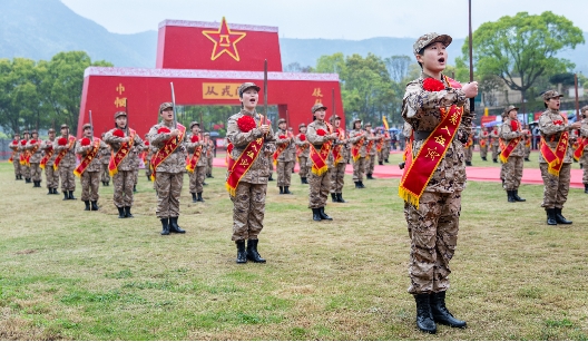仪式现场,100多名女兵穿着崭新的军装、身披绶带红花,斗志昂扬,依次接过象征着忠诚、正义、勇敢、血性和荣誉的“从戎之剑”。“‘从戎之剑’出鞘!听党指挥,能打胜仗,作风优良!”新兵们高喊誓言,庄严亮剑,充分展示着浙江女兵的过硬素质和良好精神风貌。仪式结束后,她们将奔赴各地开始崭新的军营生活。