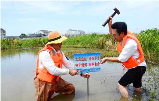 “滨安卫士”在河塘安插警示牌。