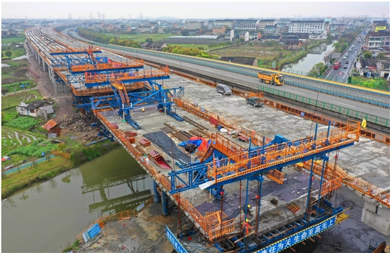 近日,甬台温高速至沿海高速温岭联络线,建设者在浇筑新河二号高架桥跨木城河最后几节连续箱梁,冲刺二号高架桥全线贯通。