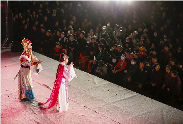4月10日,大溪镇前瓦屿村举办首届越剧春晚,邀请了国家一级演员、第二十一届中国戏剧梅花奖得主王杭娟等众多越剧名家、名角和名票前来表演《玉蜻蜓》《盘夫索夫》《梁祝》等经典折子戏,让村民们过足“戏瘾”。图为演员正在表演《山河恋》。
