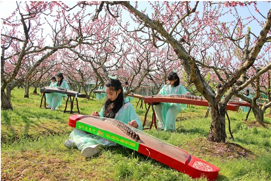 近日,箬横镇组织近20名古筝爱好者齐聚桃花林,共奏悠扬的“春”主题曲目。她们身着传统汉服,感受来自宋韵农旅文化的音乐情怀。