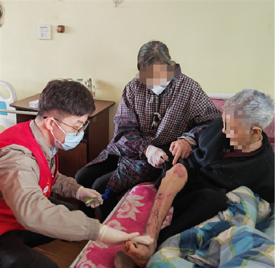 由于记挂沈阿婆的病情,烧伤科的医护人员自备了换药包及清洁用品,利用休息时间驱车来到她所在的养老院看望,这才有了开头的一幕。