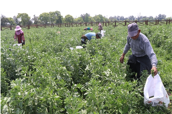 4月18日,石桥头镇土坦新村田间地头一派忙碌景象,当地种植户趁晴好天气安排小工采摘蚕豆。当下,本土蚕豆大量上市,受到了广大市民的欢迎。较之往年,近期蚕豆价格走俏。 通讯员 蒋友彬摄