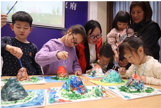 孩子们还发挥创意,用废旧报纸捏出山形,再用白色粘土铺满表面,撒上仿真青苔,涂上颜色,画上海洋,再用小树装饰,最终,一个个完整的“地球脉动”美工作品就诞生了。孩子们也在聆听和动手的过程中,感受到爱护地球的重要性。
