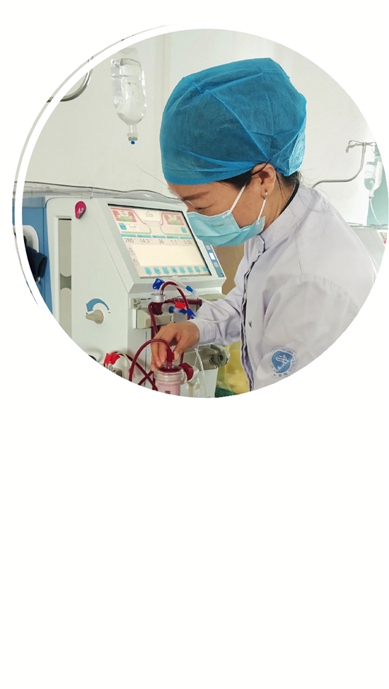 早上6点40分,主管护师孔林英准时走进血液净化室。换上护士服、戴上帽子和口罩等,孔林英马上投入工作,和同事们一起先预充管路,然后进行上机操作,直到8点后才能稍微松一口气。这种状态,孔林英在血液净化室已经持续了15年。在市中医院血液净化室,固定的血液透析患者约400位,孔林英和科室的30多位同事,共同守护这些患者的血透生命线。