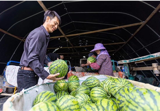 眼下正值初夏时节,也是我市西瓜首茬成熟的季节。5月12日,来自全国各地的运输车开进瓜田,装运瓜农们的新鲜西瓜,一片热闹忙碌的景象。图为箬横镇江鑫家庭农场的瓜农们正在搬运西瓜。