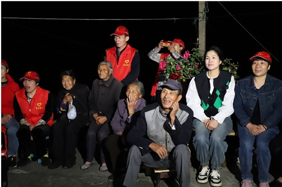 晚上7时许,天色已黑,十多名志愿者打着手电筒,沿着弯曲的山路来到徐恩夫家所在的“樟树下”自然村。在志愿者长期以来的关心帮助下,72岁的老徐看上去气色很好,一改前阵子的病态,他早早就摆好了桌子、凳子,等着志愿者的到来。到达徐恩夫家后,志愿者忙从箱子里搬出电影幕布以及投影仪,并摆放上音箱,大伙分工合作,很快将播放露天电影所需的设备架设好。接通电源后,幕布上出现了经典越剧《王老虎抢亲》的画面。幽扬委婉的江南越音,让在场的老人及志愿者听得如痴如醉,大家纷纷跟着台词小声地唱了起来。