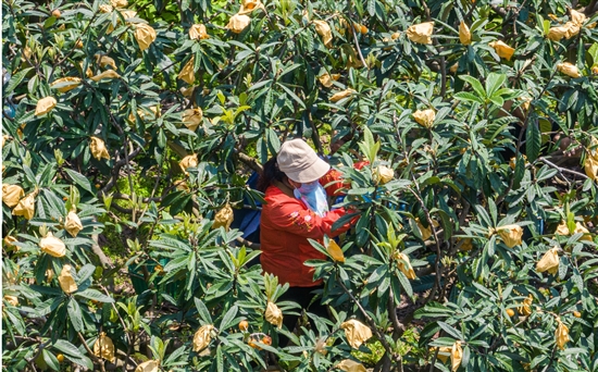 本报讯(记者赵碧莹 通讯员王双双/文 记者徐伟杰/图)5月15日,沿着温峤镇河岙村的山路一路上山,只见满山都是枇杷树,村民提篮的、拿筐的,在树群里时隐时现,没一会儿就摘了一筐筐金黄的枇杷,笑容满面地挑下了山。记者在路上碰到了村民周爱华,迎着热烈的阳光,她在自家的枇杷树上迅速摘了几颗金黄的果子,热情地塞了过来,“快尝尝我们村的枇杷,很甜的。”她的脸上是掩饰不住的笑容,就像我们上山时碰到的每一个正在采收枇杷的村民,这是属于他们的来自收获的喜悦。