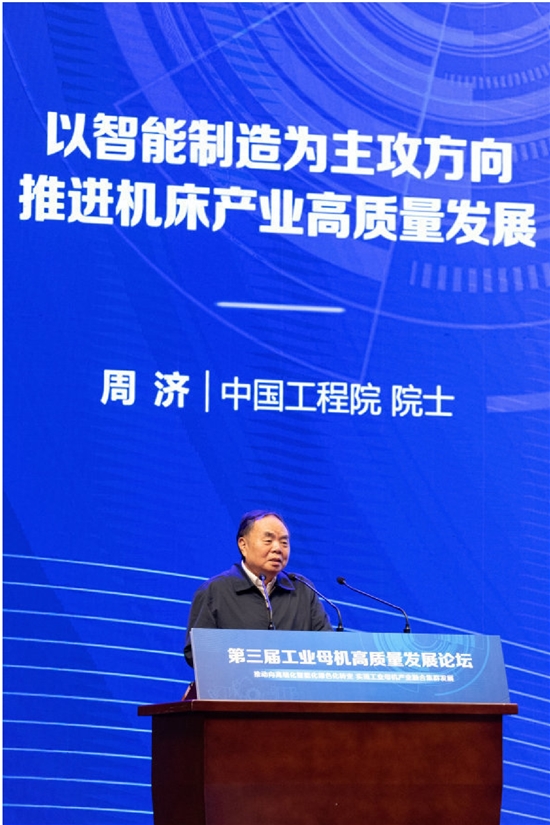 此次论坛的主题为“推动向高端化智能化绿色化转变,实现工业母机产业融合集群发展”。工业高质量发展和科技创新的交汇点在哪里?产业链和创新链的交汇点在哪里?在作“以智能制造为主攻方向,推进机床产业高质量发展”主题报告时,中国工程院院士周济认为,智能制造和绿色能源就是其中两个重要的交汇点。