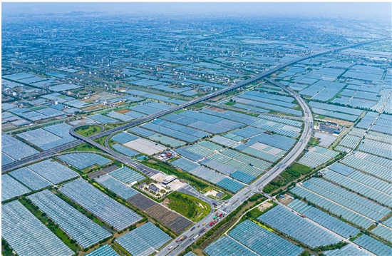 5月26日,俯瞰滨海镇东片农场,一座座果蔬大棚整齐有序地排列在田间,与错落有致的村庄和道路相互映衬,构成一幅亮丽的产业振兴新图景。