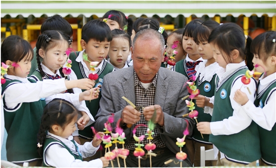 5月23日,顾齐贤走进新河镇长屿幼儿园,教孩子们做“叫头”这门传统手艺。