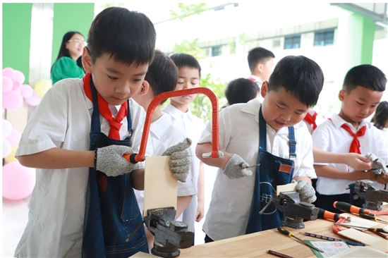 当天,在学校廊道上,设置了职业劳动体验、创造性劳动、生活小达人三大区块。其中,职业劳动体验区有割锯工艺、踩缝纫机、石磨豆浆、扎染工艺、手工编织、竹编工艺、糖葫芦制作、鸡蛋烹饪等项目,创造性劳动区有月球探测车、闪电轨道车、穿越太空(无人机)等项目,生活小达人区有巧系鞋带、折叠收纳、垃圾分类等项目。小朋友们通过打卡的形式,参与到每一个项目中来。