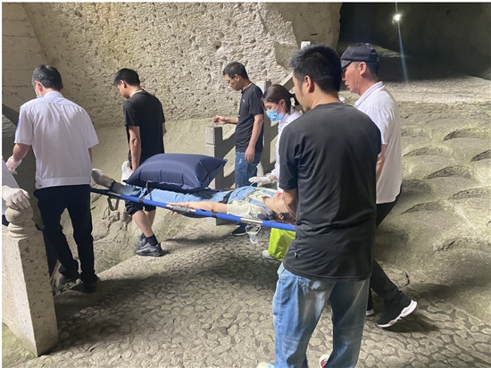 6月7日上午,市交旅集团长屿硐天智慧景区监控指挥中心接到一则求救电话,来自杭州的一名女游客在观夕硐山顶游步道上昏厥,同伴见状,当即按下SOS求救柱上的按钮求助。景区第一时间启动应急救援机制,快速组织4名员工携带担架和急救箱赶往事发地点。到达现场后,救援小队利用担架将游客抬至山下,最终,该名游客由120救护车送往附近医院,作进一步检查。