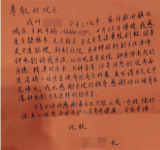 写信人是69岁的陈阿姨,她来自新河镇北城居。“钟医师人老好,实在好。”一开口,陈阿姨就夸赞起了钟医师——神经内科副主任钟承韵。4月25日傍晚,陈阿姨因左腿麻木,无力站立,被家人送到医院进行抢救。