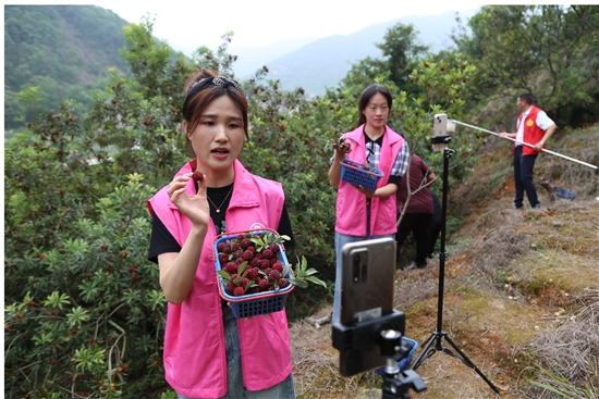 本报讯(记者张璐祎 通讯员金云国文/图)近日,城南镇双联村的天下山杨梅林里,城之南党员志愿者和妇联巾帼志愿者通过线上直播平台免费帮助农户直播带货,销售成熟上市的本地黑炭杨梅。经过3个小时的直播,累计吸引观众1846人,成交订单58笔,销售额1740元。