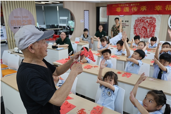 近日,在太平街道东辉社区文化礼堂,省级非遗温岭剪纸传承人林荣文向东辉幼儿园的小朋友们展示剪纸技艺。