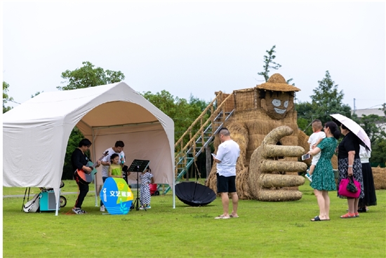 6月22日下午,天一放晴,游客们就络绎不绝。孩子们在大型的草垛里活蹦乱跳,穿梭于各个稻草人之间。谢女士一家是从大溪镇赶来的,在艺术节玩了一遍后,在草地上搭起了帐篷;邱女士带着80多岁的母亲来打卡,老母亲看到稻草人后也很兴奋,邱女士连忙为她拍照留影。邱女士说,他们一家人平时稻草见得不多,对新奇的东西都充满了兴趣。