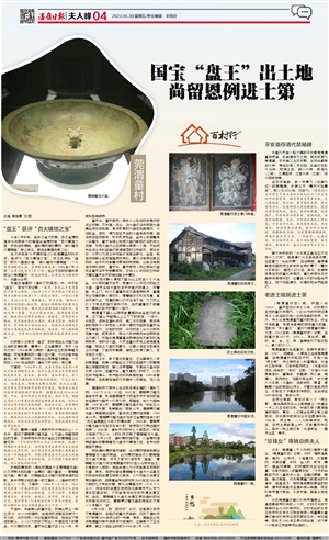 这段简介没有写“盘王”的详细出土过程及出土后的征集故事,曹锦炎、江尧章撰写、刊于《台州文物》1984年第22期的《温岭出土的西周蟠龙铜盘》可能是最早的一篇介绍文章,不过记者未能查到。李一撰写的《我县出土西周蟠龙铜盘》一文则收入1987年出版的《温岭文史资料》第三辑。