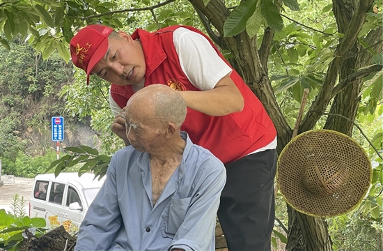 本报讯(记者钟艾轩文/图)天气愈来愈热,山上的老人下山不方便,近日,张金华带着城南义工服务队来到城南镇照谷村,给老人们理发、送药,陪他们聊天。