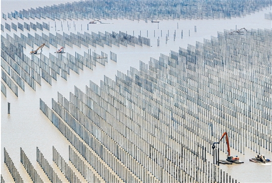 近日,温岭市东部松门渔光互补光伏电站项目建设现场,施工人员各就其位进行管桩吊运、滩涂拖桩、定位打桩等工序,现场一派繁忙景象。