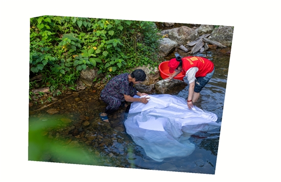 村里有一条清澈见底的山间小溪,义工们带来用脏的电影幕布准备在溪水里清洗。金志云的老伴,69岁的陈冬妹是一位聋哑人。她热情地向义工打手势表示欢迎,随后回家拿来肥皂和刷子帮忙一起洗电影幕布。