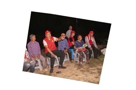 傍晚,在一个鸡舍前的小草场上,义工们忙着搭木架,固定幕布,开始放映前的准备工作。天色渐渐暗了下来,夜幕笼罩下的山村一改往日的静谧。此时的小草场上,早已坐满了老人,阿华调试好设备,将影片投射到幕布上,老人们则翘首期盼,看一场专属于他们的爱心电影。