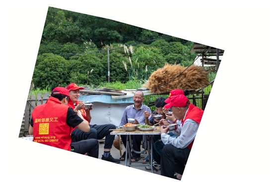晚饭时间到了,金志云煮了粥,炒了自家种的蔬菜,摊了土鸡蛋,和义工们分享。老人们没有富裕的物资,他们用最朴实的方式,表达着内心的感谢。义工们和金志云夫妻坐在院子里聊天谈心,他们脸上露出了久违的笑容。