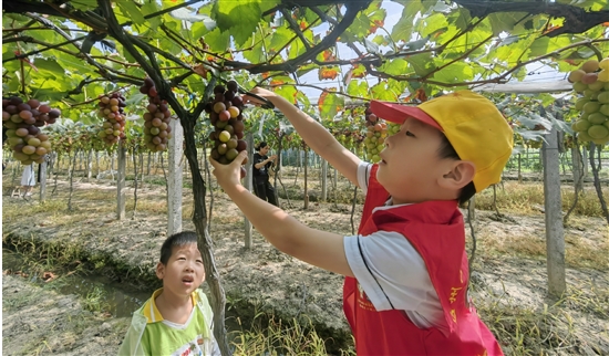 原来,这些小志愿者正在义卖亲手采摘的爱心葡萄。当天上午,位于新河镇蔡洋村的火速爱心葡萄基地里,这群穿着红马甲的小红萌志愿者,在果园主人崔阿婆的带领下,热火朝天地采摘挂满枝头的葡萄。