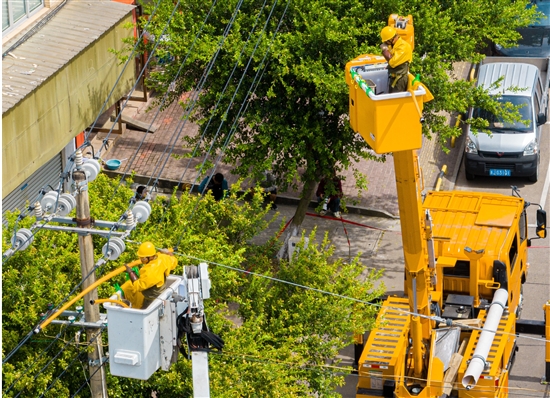 近日,国网温岭市供电公司带电作业班的工作人员在新河镇新新南路实施常态化不停电作业。进入“三伏”天以来,我市高温持续,城乡用电负荷不断攀升。为最大限度保障生产生活用电,国网温岭市供电公司从容应对,全力护航持续、稳定、优质的电力供应。 记者 徐伟杰摄