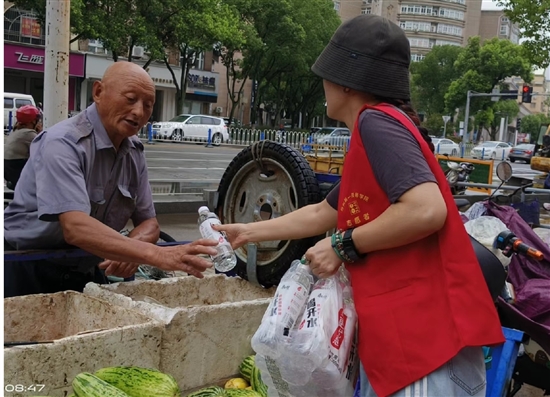 7月28日上午,台州第一技师学院组织志愿者在市区购物中心周边开展“公益一杯水 清凉一座城”志愿服务活动。志愿者们为环卫工人、交警、建筑工人等户外工作者送去慰问、带去清凉,并提醒他们以及沿街商铺做好台风安全防护工作。