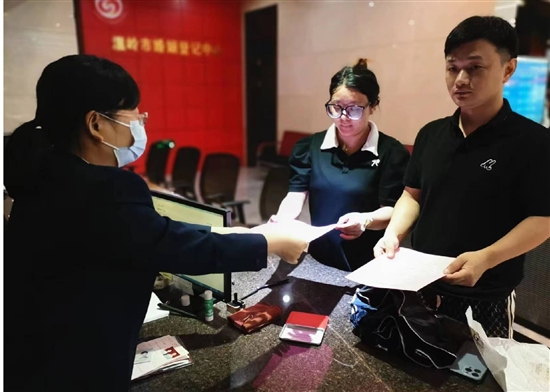 7月28日,温岭市级文明单位市民政局组织志愿者开展“清凉一夏 喜迎亚运”志愿服务活动,向新婚夫妇发放“文明新风”倡议书。 通讯员 陈鹏建摄