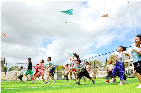 近日,在滨海镇全民健身中心,小朋友们正在参加放飞纸飞机比赛。