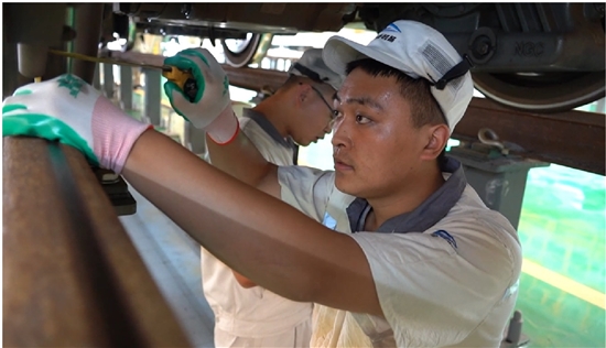 最后一项工作需要到列车上方进行,检修员们依次穿戴好安全装置,爬到列车顶端,对顶部设施进行更为细致的检测和养护。等他们从列车顶部下来时,衣服被安全装置勒出一道道汗水的痕迹,他们却不以为然,表示早就习惯了。