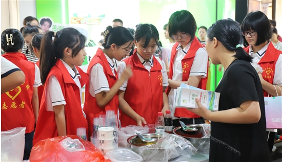 本报讯(记者江琳 通讯员金缪悦/文 通讯员孙秀琴/图)“你好,欢迎参加我们的爱心义卖活动,感谢您的支持!”“我们向您发出倡议:用环保袋替代塑料袋,共享绿色生活,呵护美丽家园。”近日,在银泰城地下一楼,一群来自温中实验学校的学生身穿红色志愿马甲,手拿环保标语标牌和宣传资料,向路人发起倡议,并邀请他们开展爱心助力。