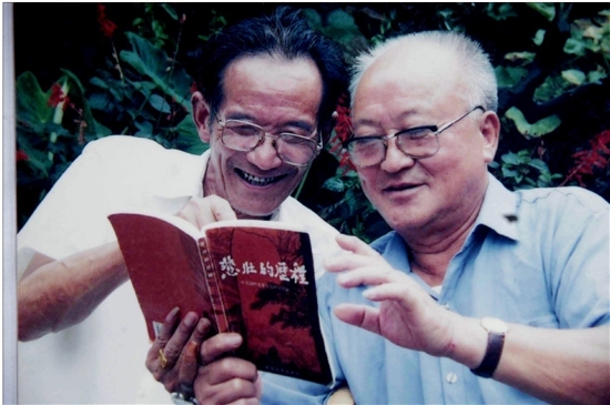 2000年7月18日,陈荣廉老师(右)祝贺好友童士元先生(左)为红十三军第二师编写的《悲壮的历程》一书出版。