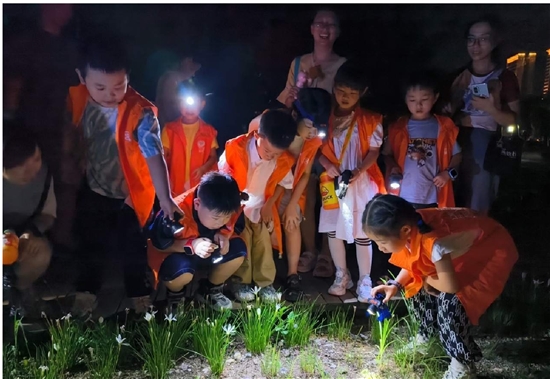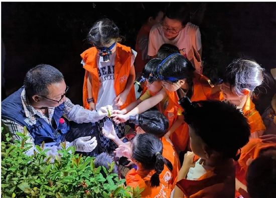 随后,老师把学生们分成两组,大家往草丛深处前行,不一会儿就抓到了两只青蛙。孩子们围着老师,近距离观察着青蛙,一个个睁大眼睛不断发问。陪同孩子前来的家长,也对活动充满了兴趣,拿着手机不停拍照,跟随着老师找青蛙、福寿螺、萤火虫等,回忆美好的童年时光。“这场大自然微观之夜探秘活动,可以让孩子们近距离观察并触摸小动物,观赏、聆听和感受自然生命的神奇,进一步提升勇气、增长见识。”工作室的老师表示。