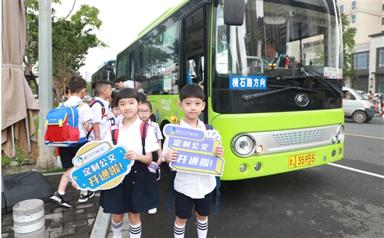 这是该校当日正式投入运行的5条“定制公交”专线之一,将以从家到校“点对点”定时往返的公交车接送方式,护航学生们安全、高效上下学。