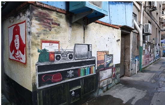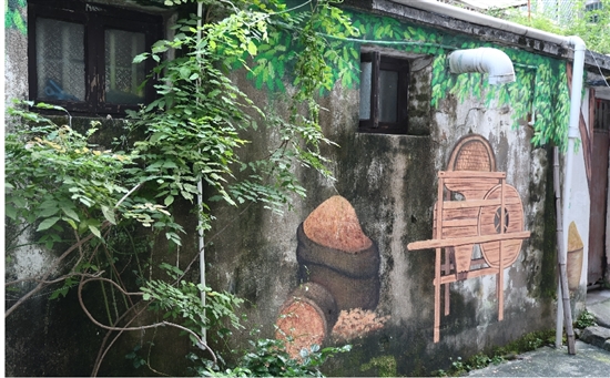 太平新村设计了“70年代时光街区”“80年代时光街区”和“90年代时光街区”3个街区。一墙一风景,一墙一特色,每个时光街区都画上了代表各个年代的特色墙绘,反映当时的真实生活。画师还充分结合周围环境进行即兴创作,原本满是苔藓的墙面在画笔下成了秋天的草地,一根根下水管道被绘成了毛竹或粗壮的树干,出乎意料,又让人倍感惊喜。