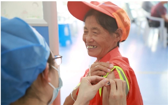 城西街道社区卫生服务中心相关工作人员介绍,整个接种流程从预检、登记、接种到留观,实行闭环管理,避免突发情况,确保环卫工人接种安全、有序。