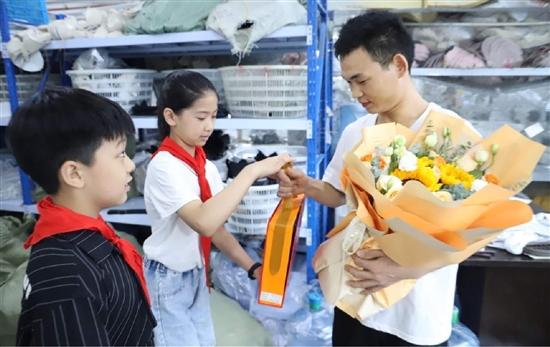 “陈涛叔叔,你是我们的榜样,这束鲜花送给你,祝你国庆、中秋双节快乐。”在安尔足鞋业,两名来自横峰小学的学生志愿者把鲜花和月饼等礼物送到“台州好人”陈涛手里,感谢他的见义勇为。当天,他们还先后走访慰问了林正亭、蔡可正等“好人”和道德模范。每到一处,学生志愿者送上鲜花、月饼等礼物,带去节日的祝福,并合影留念。