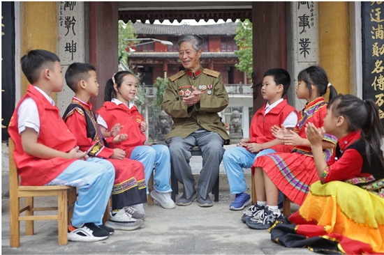 在戚继光纪念馆大门口,孩子们围着叶爷爷,听他讲古代和近现代的爱国故事。一句句朴实的话语,蕴含着浓厚的军人情结和无私的爱国情怀。孩子们纷纷表示要学习老兵和爱国英雄的勇敢无畏精神,长大了要报效祖国。